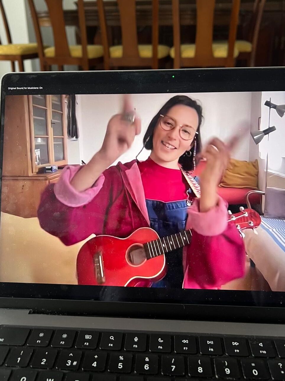 All you need is your ukulele, a good internet connection and a way to connect. Sylvia prefers to use Zoom on a laptop, which also works on mobile phones and tablets. A WhatsApp video call can be possible as well.